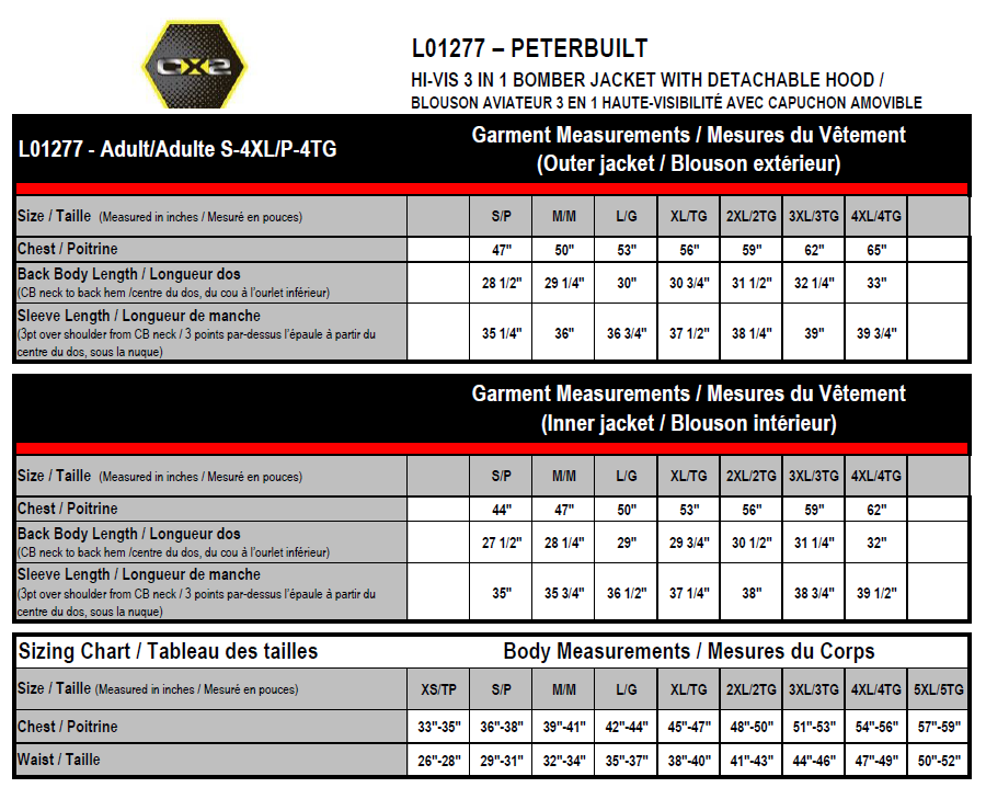 Outer jacket: 215 gsm – 6.3 oz./yd2 – 10.5 oz./lin yd 100% polyester oxford 3000 mm waterproof rating, 3000 gsm breathability rating, wind resistant and water repellent finish. Inner jacket: 68 gsm – 2 oz./yd2 – 3.5 oz./lin. yd 100% polyester taffeta with wind resistant and water repellent finish. Insulation: 180gsm 100% polyester.  Exterior jacket fully seam sealed with waterproof, breathable coating.  Snap detachable hood with adjustable drawcord.  Chest zipper pocket and ID pocket.  Lower front welt pockets with zipper closure. Adjustable tabs on sleeve cuff. Two inner patch pockets. Zocket embroidery access. Zip out insulated quilted inner jacket.  Rib knit collar and cuff.  Patch pockets on exterior and interior of inner jacket.  YKK zippers.  4” hi-vis contrast band with 2” reflective tape on front and back body and sleeves.  Meets CSA standards.